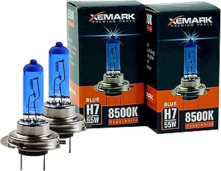 XEMARK Lot de 2 ampoules halogènes H7, 55 W, 12 V, Ampoule bleue, aspect xénon super blanc, lot d’ampoules pour voitures, feux de croisement, 2 pièces