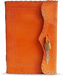 Jaald 25 cm Bloc-notes Carnet Cahier Feuilles Leather journal Intime avec Couverture en Cuir Fait à la Main Verrouiller Cadenas - Orange